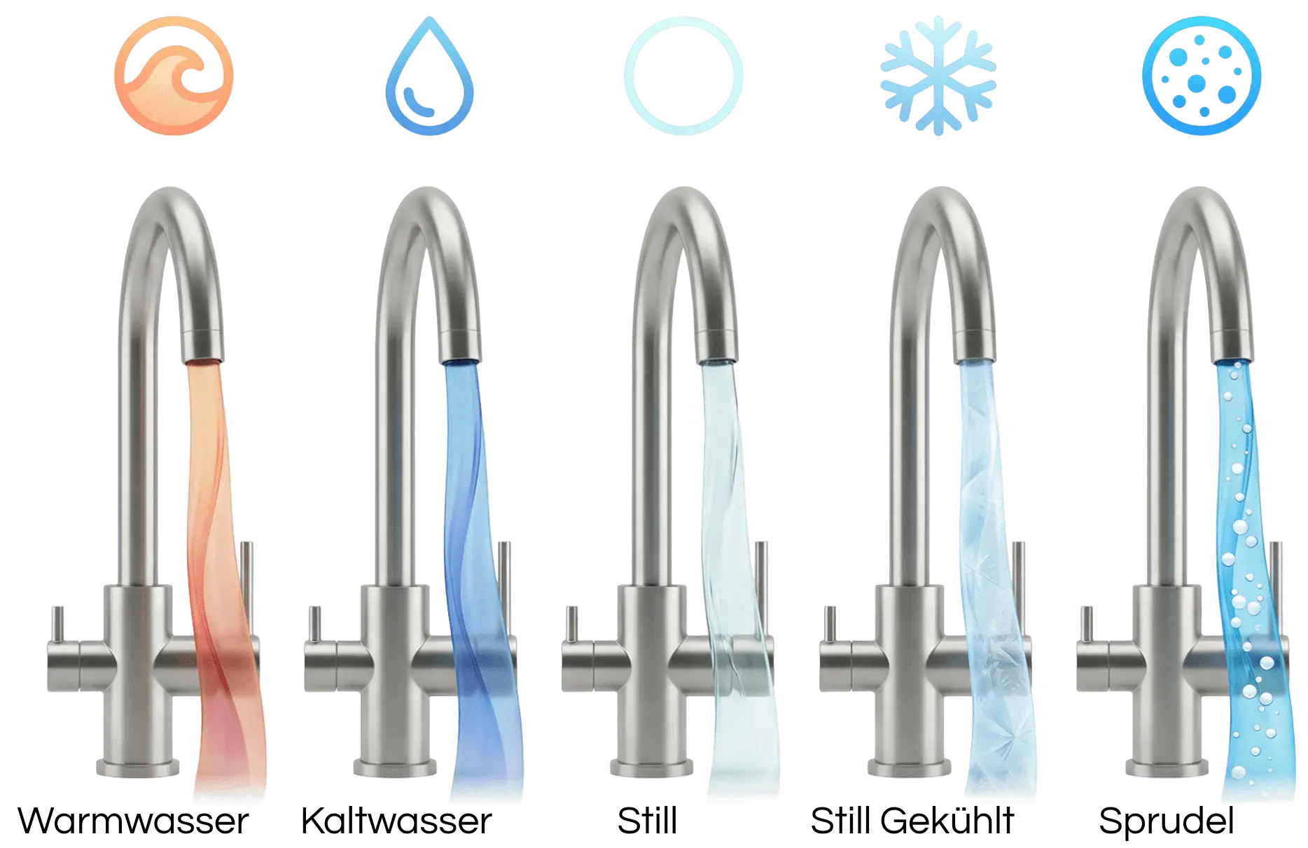 Sprudelwasser, stilles oder gefiltertes Wasser werden nicht durch die Armatur selbst erzeugt, sondern über ein separat angeschlossenes Wassersprudel- oder Filtersystem