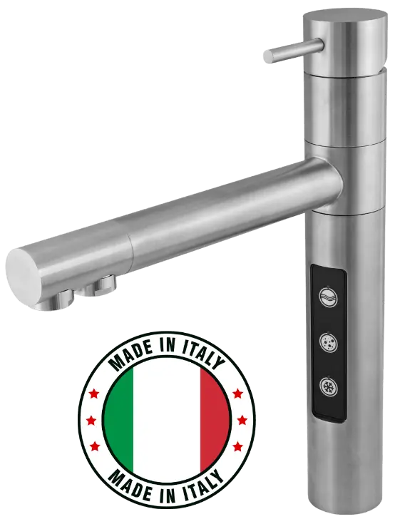 Die STELLA ist eine handgefertigte 5-Wege-Armatur aus massivem Edelstahl, entwickelt für anspruchsvolle Küchen, Büros und Designumgebungen. Sie kombiniert klassisches Spülwasser mit elektronisch gesteuerter Trinkwasserausgabe über Drucktasten. Gefertigt in italienischer Manufaktur – hochwertig, langlebig und flexibel einsetzbar mit nahezu allen Sprudelsystemen.