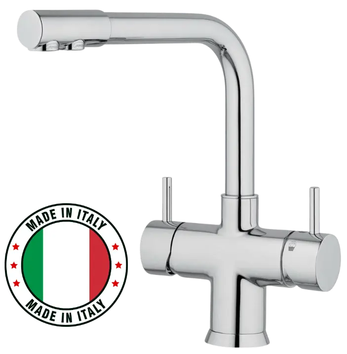 Die NOBIUS 5-Wege-Armatur vereint klassisches Warm- und Kaltwasser mit stillen, gekühlten und sprudelnden Trinkwasseroptionen in einer hochwertigen Küchenarmatur. Gefertigt aus verchromtem Messing und hergestellt in Italien, überzeugt diese Variante mit festem L-Auslauf und einer reduzierten Auslaufhöhe von 26 cm – ideal für Küchen mit geringerer Aufbauhöhe oder Oberschränken.