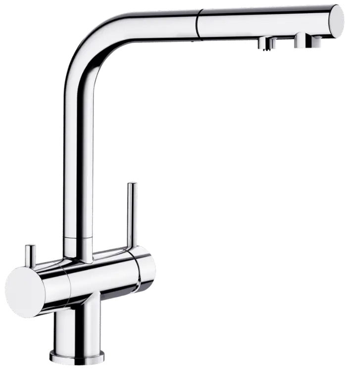 Klassisches Warm- und Kaltwasser wie bei einer Küchenarmatur – ergänzt durch eine dritte, separate Leitung für gefiltertes Trinkwasser. Die BLANCO 3-Wege-Armatur aus hochwertigem Messing bietet zusätzlich eine ausziehbare Brause für maximale Flexibilität und ist in Chrom oder Edelstahl gebürstet erhältlich.