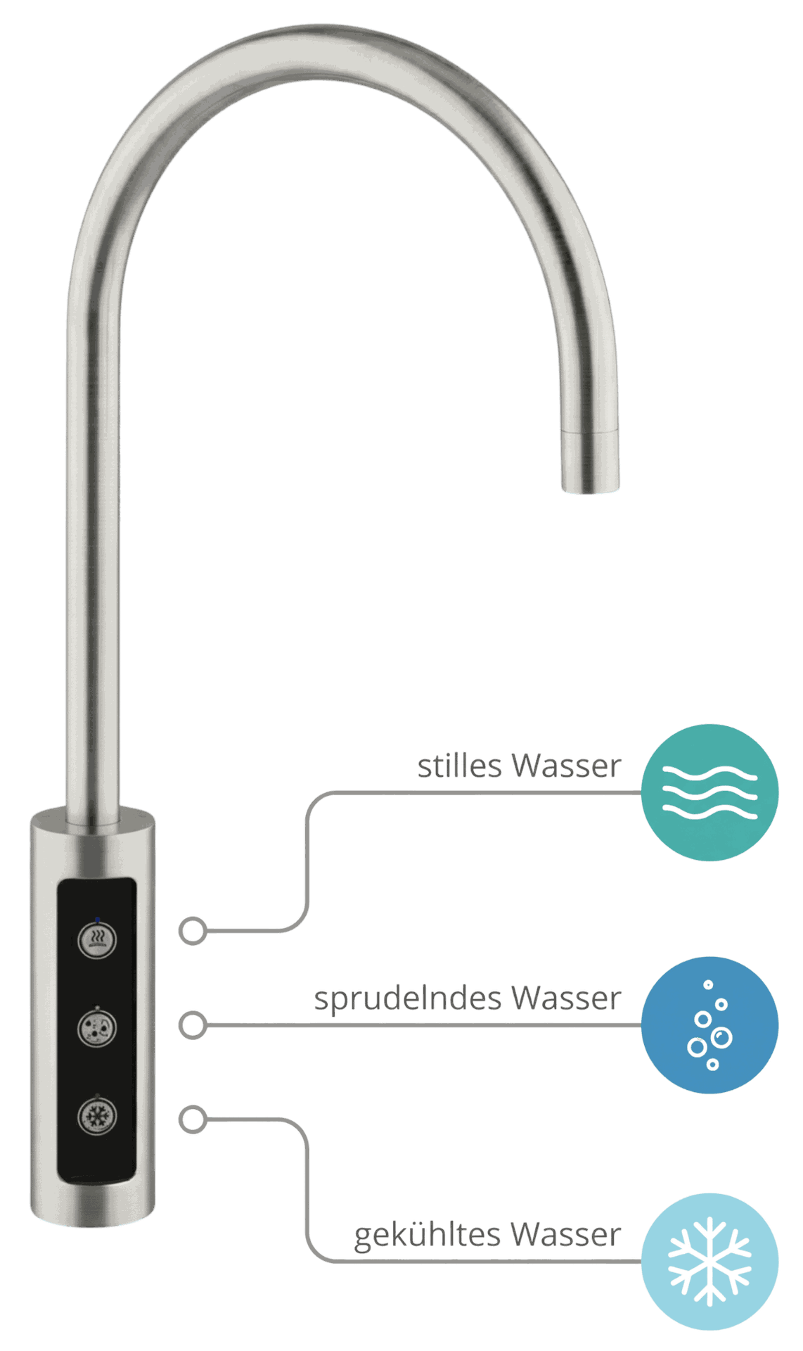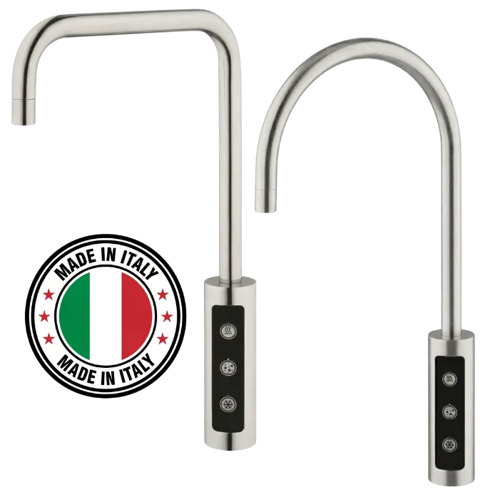 Der LARA Zusatzwasserhahn ist die elegante Ergänzung zu Ihrer bestehenden Küchenarmatur. Speziell für Wassersprudelsysteme entwickelt, gibt er stilles Wasser, gekühltes Wasser oder gekühltes Sprudelwasser per Knopfdruck aus. Gefertigt aus massivem Edelstahl, 360° schwenkbar und elektronisch gesteuert – für maximalen Komfort und klare Trennung vom Leitungswasser.