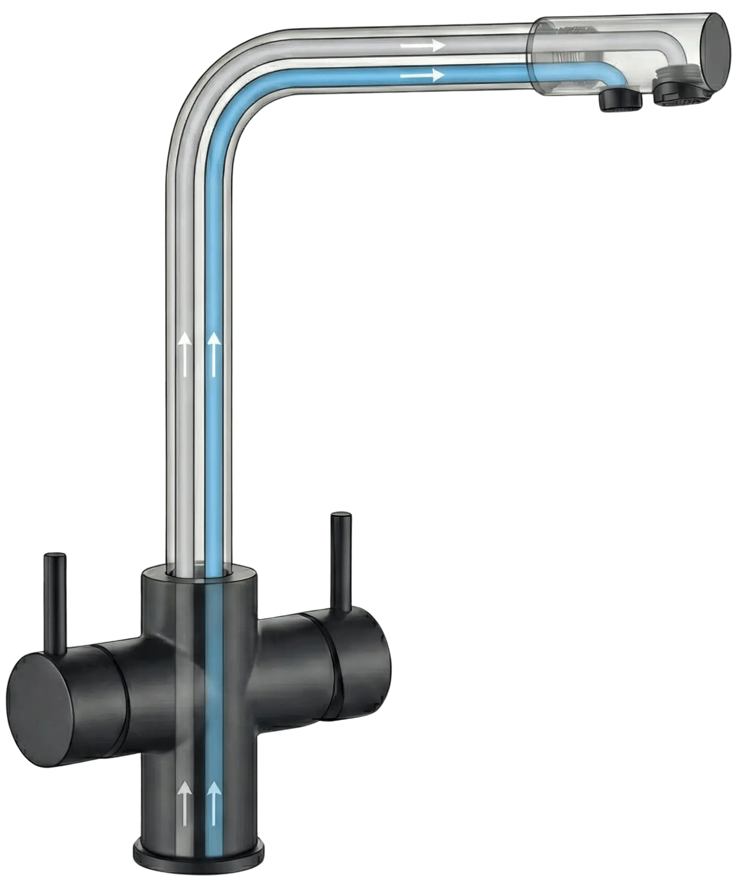 Sprudelwasser, stilles oder gefiltertes Wasser werden nicht durch die Armatur selbst erzeugt, sondern über ein separat angeschlossenes Wassersprudel- oder Filtersystem bereitgestellt.