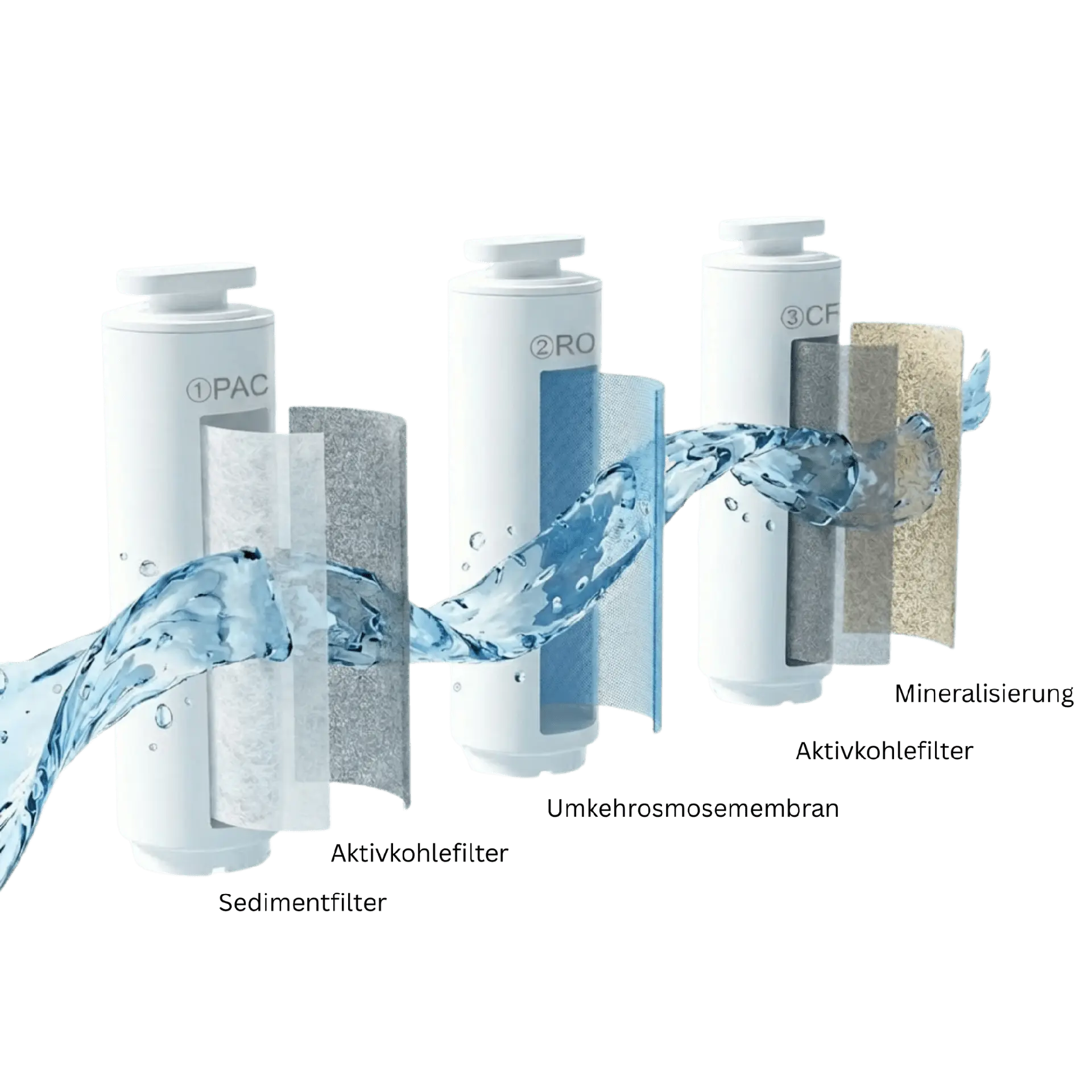 Empfohlene Wechselintervalle: PAC Sediment-Carbonfilter: alle 6 Monate, CF Carbonfilter: alle 6 Monate, RO-Membran: alle 12–24 Monate (abhängig von Nutzung & Wasserqualität)