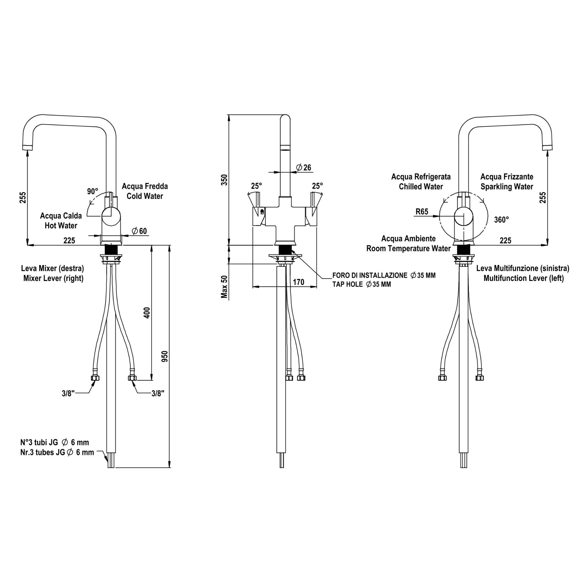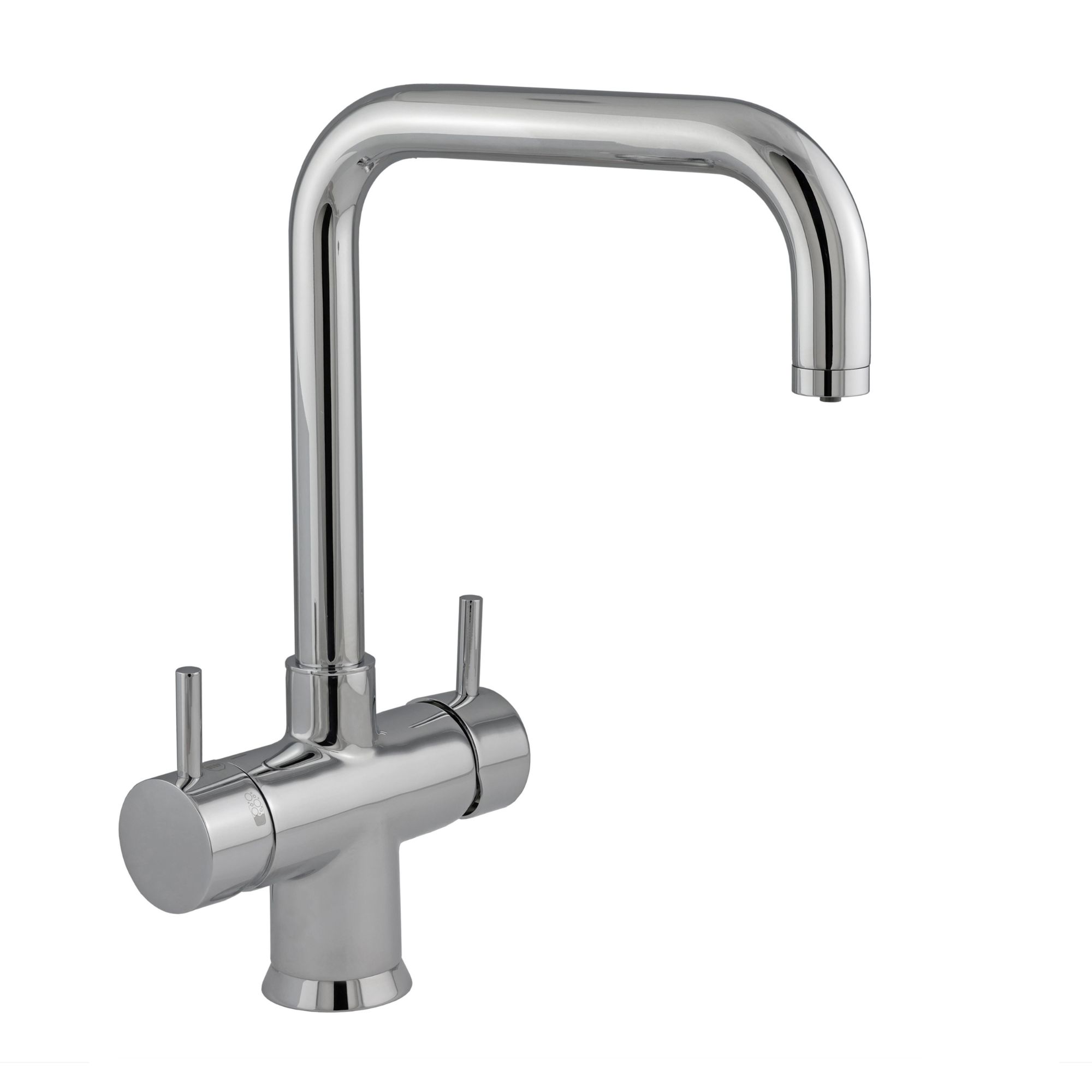 Eleganter, moderner Fünf-Wege-Wasserhahn. Getrennte Ausläufe für normales und gefiltertes Trinkwasser. Chrom. Made in Italy